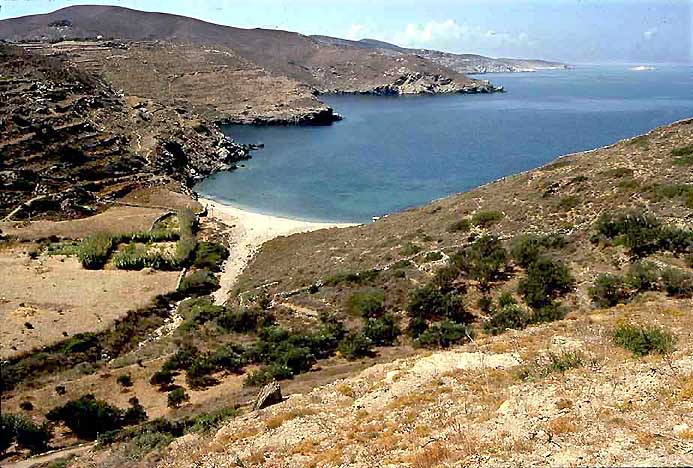map of Amorgos) from where we hiked back to Katapola. Cornelius on the hill of the Cycladic settlement of Dokathismata. The chapel of Aghii Serandis is out of sight in the valley below. Katapola and the harbor bay hide behind the mountain in the middle distance.|
