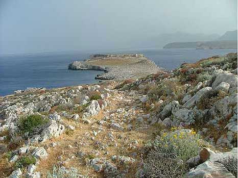 Rock islands and mountains along the coast of the Peleponnes.